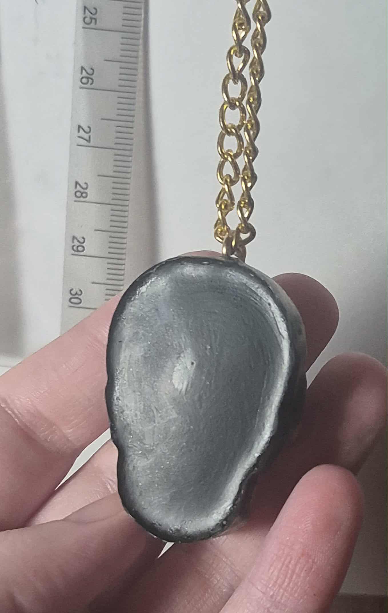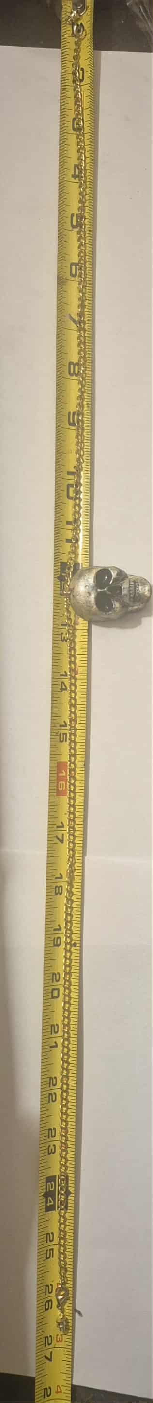 This is a one of a kind hand made polymer clay Skull necklace painted gold with approximately 26 inches metal chain with a barrel screw clasp in the color of gold.