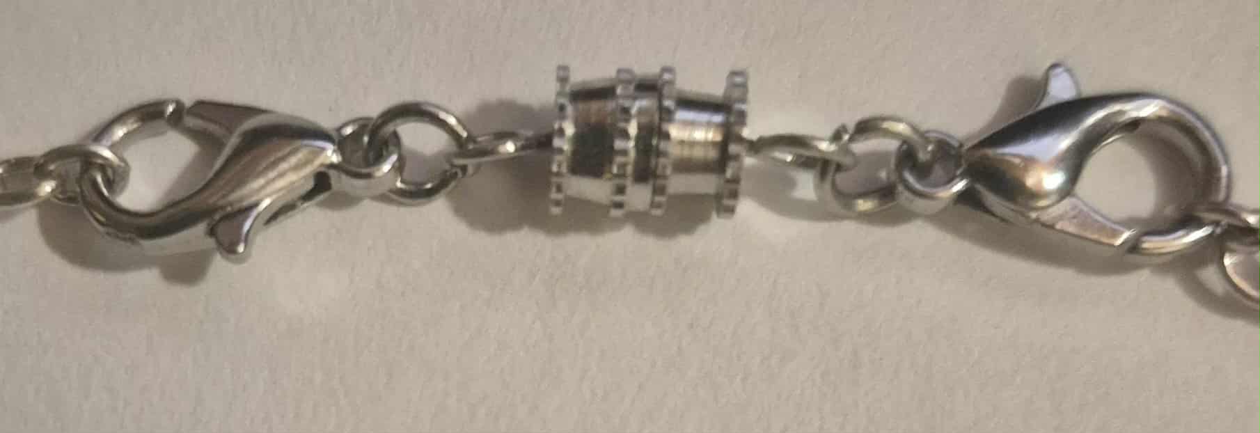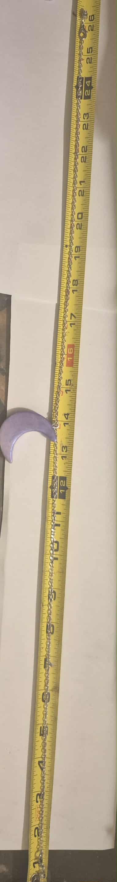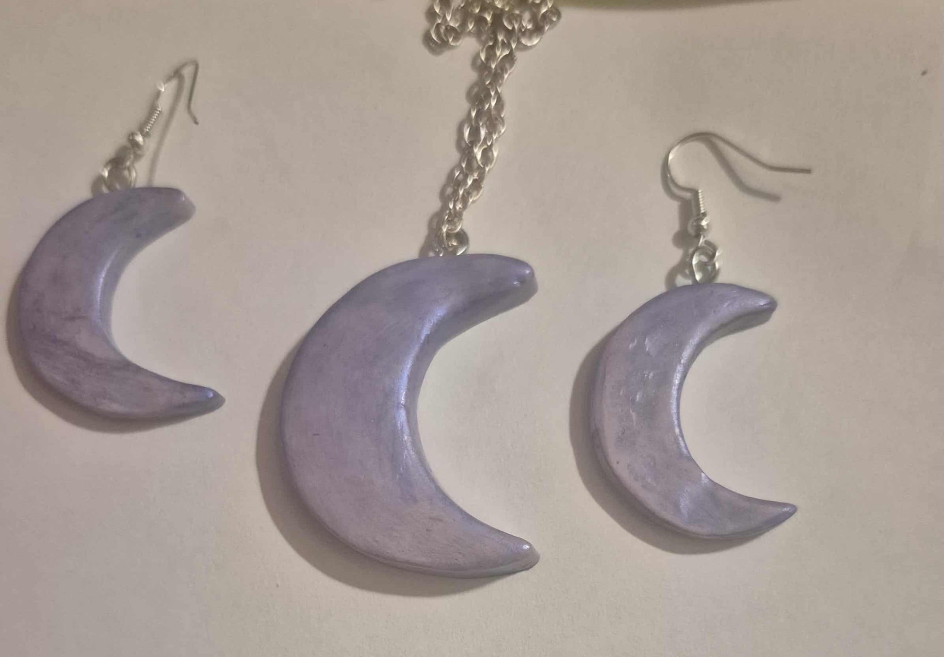 This is a handmade set of polymer clay Iridescence Moon necklace and earrings , The chain is metal approximately 26 inches long in the color silver with a double barrel clasp.